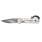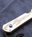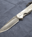 The Blade: The Large version gives its user 3.5 inches of polished, shaving sharp cutting edge built from premium Devin Thomas stainless Ladder damascus steel. It is hollow ground for supreme sharpness and fully usable for day to day. A thumb ramp on the spine has perfect jimping, nearly an inch and perfect placement. The rest of the spine is crowned, smooth and polished. This version features a single Silver titanium thumb lug opener allowing the user to open the blade from the front side. It operates on a pivot system using oversized bronze washers with grease-filled pockets for smooth, no friction operation. Lock up is always solid and reliable.